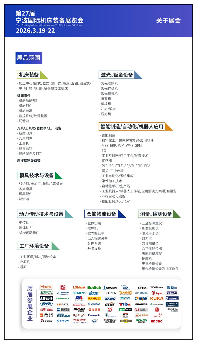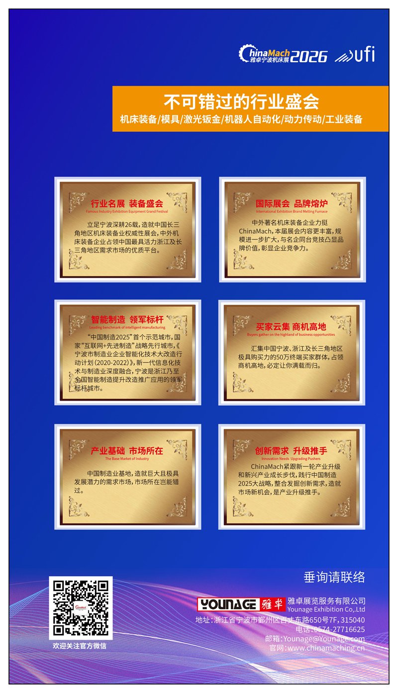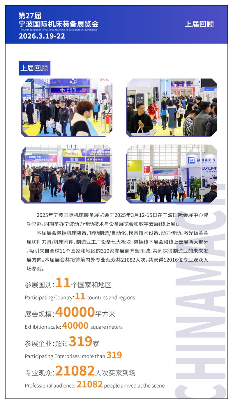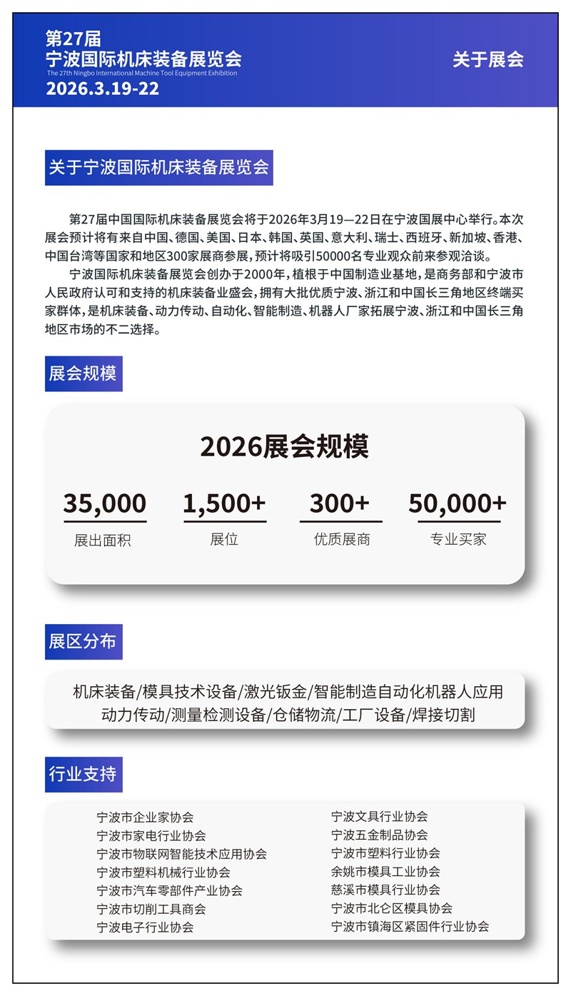 第27届中国国际机床装备展览会将于2026年3月19-22日在宁波国展中心举行。本次展会预计将有来自中国、德国、美国、日本、韩国、英国、意大利、瑞士、西班牙、新加坡、香港、中国台湾等国家和地区300家展商参展,预计将吸引50000名专业观众前来参观洽谈。宁波国际机床装备展览会创办于2000年,植根于中国制造业基地,是商务部和宁波市人民政府认可和支持的机床装备业盛会,拥有大批优质宁波、浙江和中国长三角地区终端买家群体,是机床装备、动力传动、自动化、智能制造、机器人厂家拓展宁波、浙江和中国长三角地区市场的不二选择