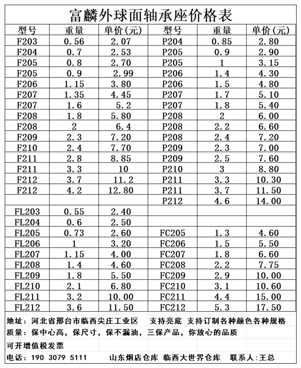 价格表(富麟外球面轴承座)